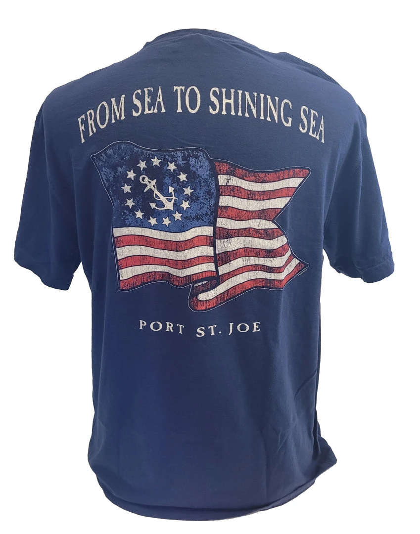 Made from 100% cotton, this tee features an American Flag with the saying “From sea to shining sea”