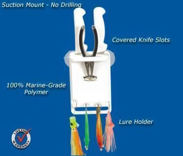Fisherman’s storage solution, compact design holds 2 knives in covered slots, pliers, and up to 20 hooks, lures, and rigs in 9 holes and 4″ slot on bottom of unit. It is suction cup mounted so holes to drill. Constructed of 100% marine-grade polymer.