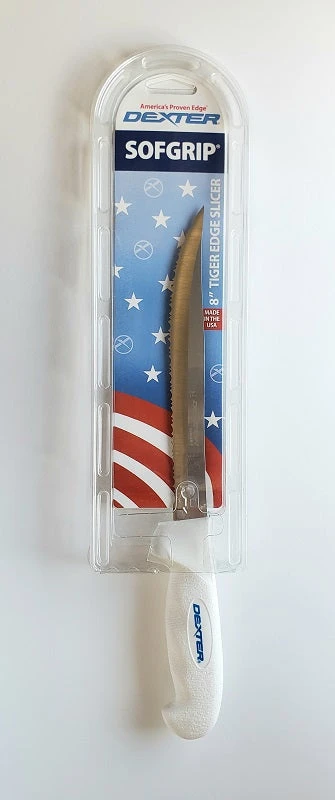 The Dexter SG142-8TE legendary Tiger Edge scalloped cuts through fresh and frozen bait, scales and can fillet a fish with ease. Itβs a great all-around knife for bait, cutting cartilage and help processing your fish. It features our SOFGRIP handle that is soft to the grip and provides great control along with slip resistance. It features our proprietary high carbon, high alloy, stain free DEXSTEEL. This model does not include a sheath.