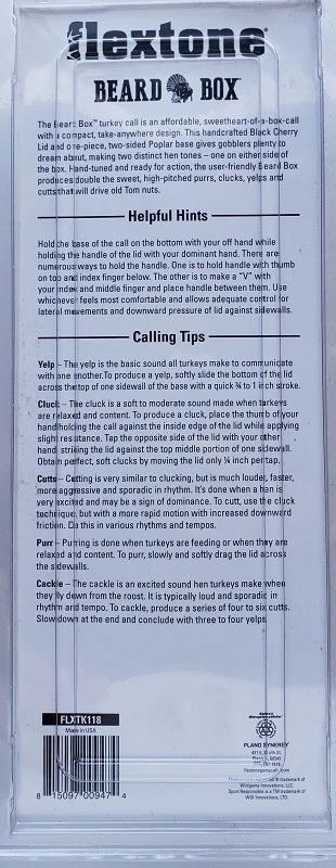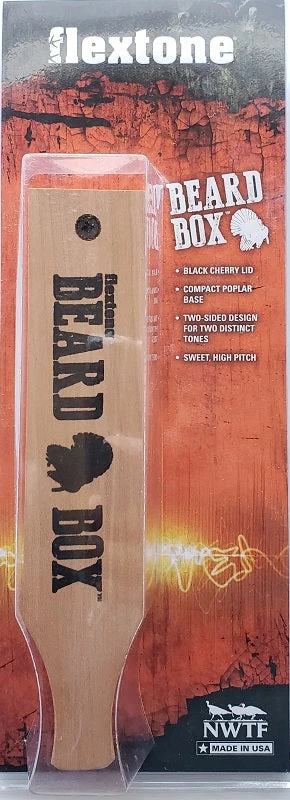 Turkey hunters love the Beard Boxâ„¢ for its compact, take-anywhere design and its sweet turkey sounds. We handcrafted this box call with a black cherry lid and two-sided poplar base. Hand-tuned to perfection, both pieces come together for two distinct tones ” one on each side of the base. Ready for action and hand-tuned to perfection, you’ll get double the purrs, cuts, clucks and yelps to drive any old tom nuts.