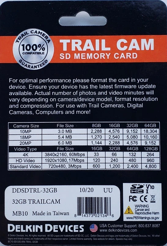 Designed specifically for trail cameras and other handheld devices, the Delkin Devices® 32GB SD Memory Card will satisfy all of your digital storage needs. Memory Card is waterproof and shockproof, and will support full HD 1080p video recordings, along with JPEG and RAW still photography.