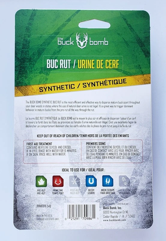 For areas where natural urines are not allowed, Buck Bomb BucRut imitates fresh urine collected from bucks that are at least 3.5 years old. As the same scent that is found in the Synthetic BucRut Bomb, BucRut will boost the drawing power of your mock scrapes, particularly during the pre-rut and peak rut period when bucks are most aggressive and territorial.