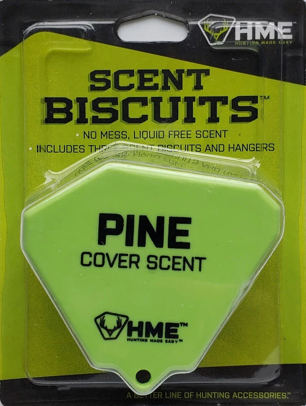 Pine is one of the most potent cover scents. For best results pin on to yourself or in close proximately to your stand or blind. When not in use, place Scent Biscuits back in original container to keep fresh. HME Scent Biscuits are available in a wide variety of scents. Scents come with hangers so you can attach nearly anywhere. Reusable when biscuits are stored in their air tight container.