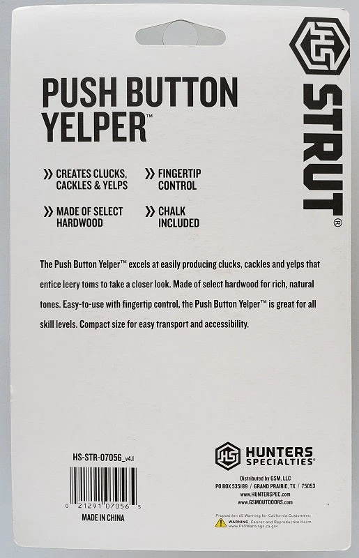 The Hunter Specialties Push Button Yelper Call easily produces all the sounds of a wild turkey without the large learning curve associated with some turkey calls.