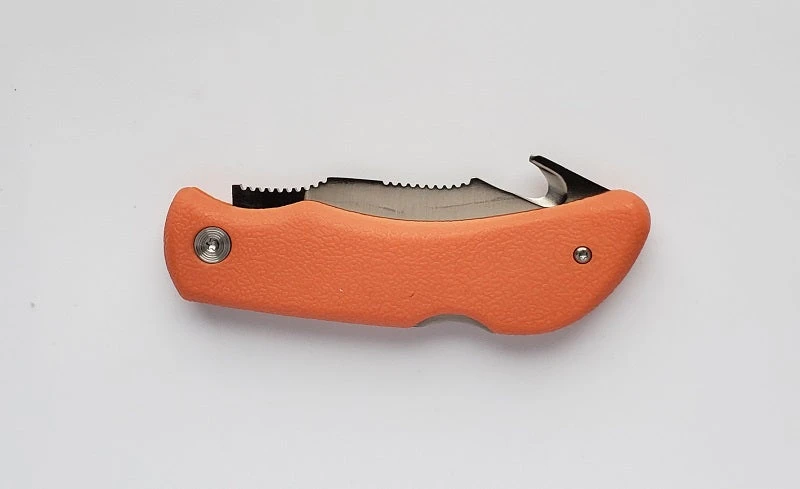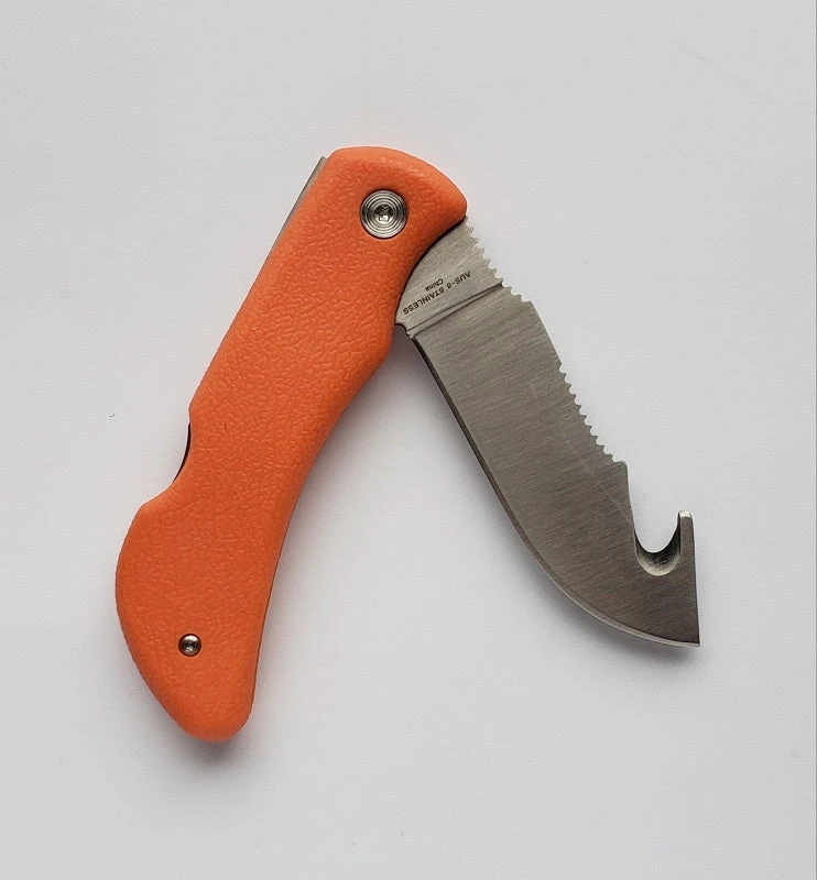 This folding gut-hook skinner is the perfect compact and lightweight hunting knife. Features a 3.2 inch Japanese AUS-8 stainless blade that is precisely heat treated and hand finished shaving-sharp for superior edge retention and performance. The gut-hook opens game like a zipper without piercing internal organs. Rubberized orange TPR handle scales are mounted to sturdy stainless steel liners for unparalleled strength and a secure, non-slip grip, even when wet. The blaze-orange handle is easy to spot on the ground, saving valuable time in the field while preventing loss. Each knife comes complete with a Mossy Oak® camo belt sheath with H-style belt loops for both vertical and horizontal carry options.