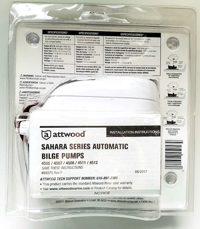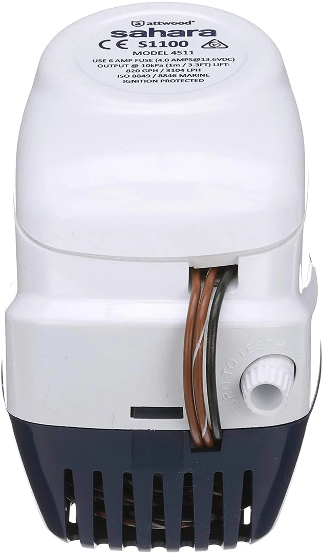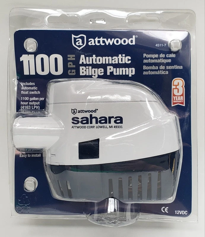 This Attwood Sahara S1100 Automatic Bilge Pump provides reliable bilge water pumping for boats of any size. This pump meets the requirement of an automatic-switch bilge pump for any vessels 20 feet and over with sleeping accommodations. This S1100 model is high-capacity for larger boats and yachts. This pump is a compact and durable package that includes the pump, wire seals, strainer, and mercury-free switch all in one unit that installs quickly and easily in tight spaces. It mounts horizontally only. This 12-volt, 1.5-amp draw pump is rated for 1,100 GPH performance at open flow (at voltage of 13.6 volts DC), and it draws only 1.5 amps at open flow. It comes with a 29-inch length of 16-gauge caulked and tinned copper wire, and uses a 1-1/8”-inch interior diameter hose. Attwood Corporation has been an award-winning leader in engineering, testing, and manufacturing of the highest quality marine products for over 100 years. We deliver safe and reliable lighting, fuel systems, water systems, seating & pedestals, swim ladders, custom upholstery, and general marine accessories that are easy to install and meet regulatory compliance.