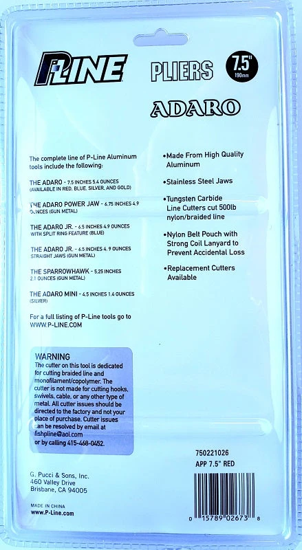 P-Line Adaro Pliers feature machine cut Aluminum handles for reduced weight. The tungsten carbide cutters are built specifically for braided line. The jaws are made of a coated carbon steel for strength and durability. Adaro Pliers come with a cordura pouch and a heavy duty nylon lanyard, making it the ultimate value for the serious Saltwater Angler.