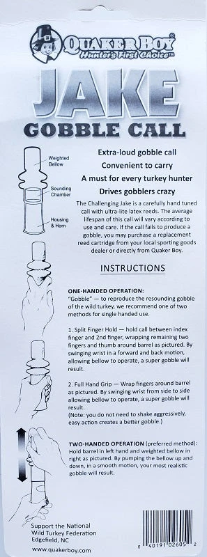 The Challenging Jake gobble call is a shaker call that has the high pitch gobble of a young jake. Remarkable sound quality and volume. Operable with one or two hands. Simple to use.