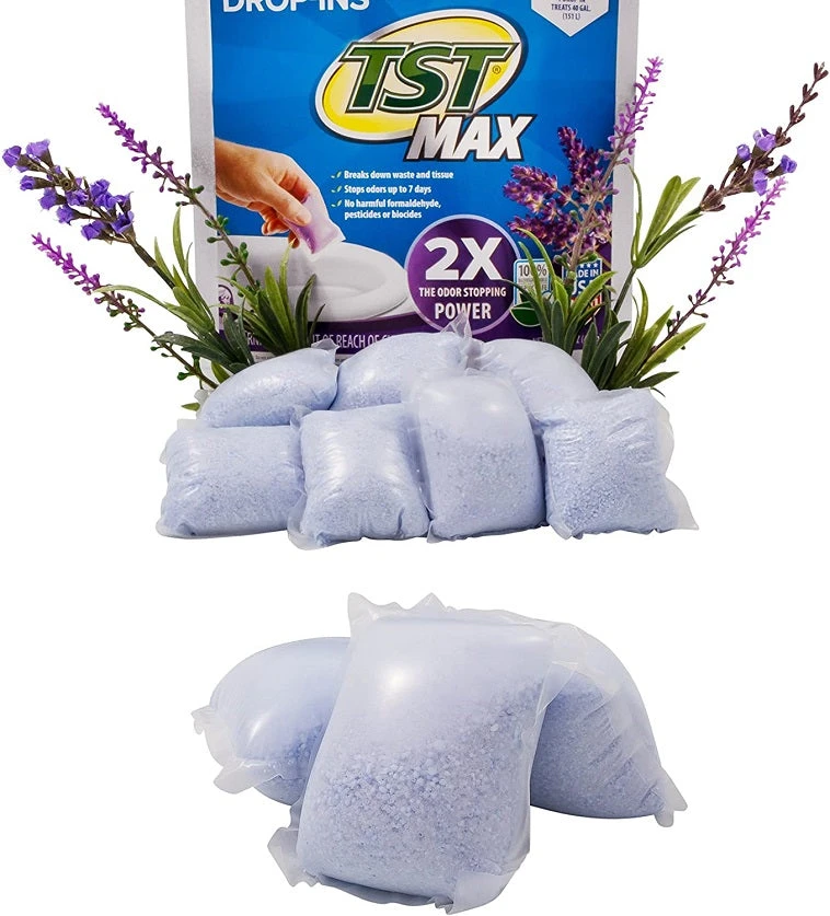 TST MAX RV Toilet Treatments help control unwanted odors and break down waste and tissue in your black water holding tank. The easy-to-use toilet treatments contain a special chemical that helps break down waste. A blend of lavender-scented surfactant oils trap unwanted odors in your tank, making your camping experience more enjoyable. The toilet treatments are RV and marine-approved, non-formaldehyde, and safe for all septic tanks. They’re even great for portable camping toilets. One drop-in treats up to 40 gallons.