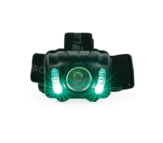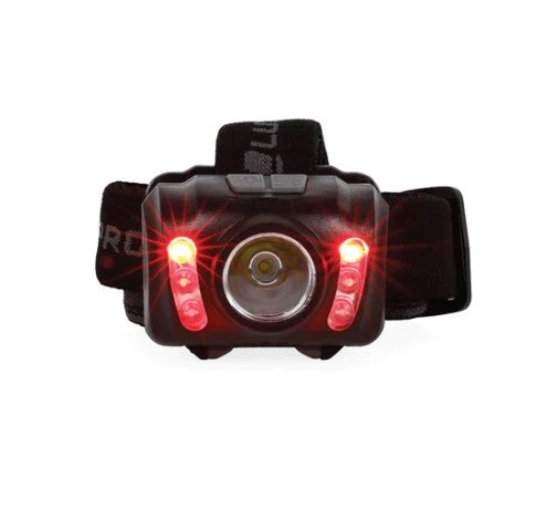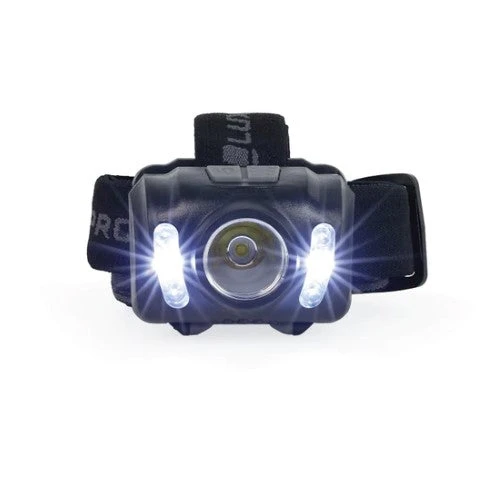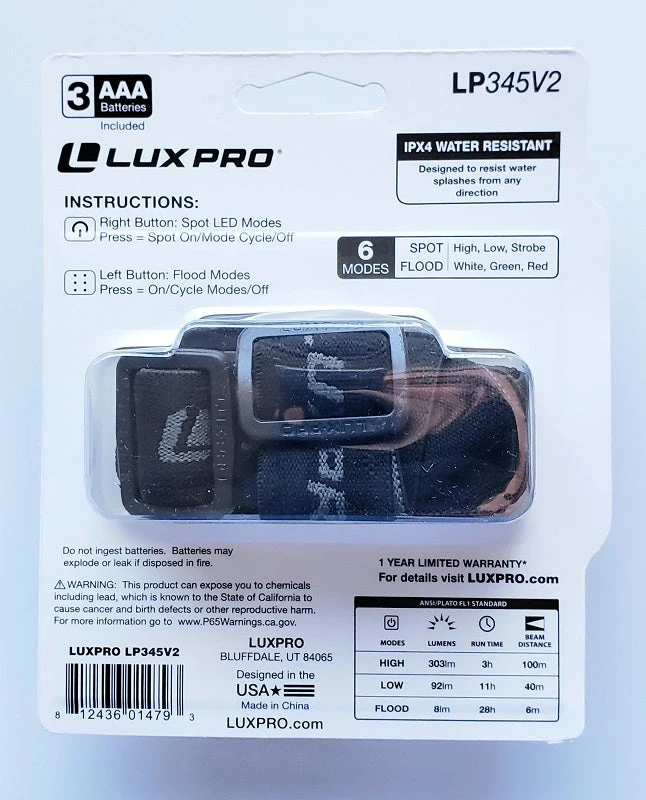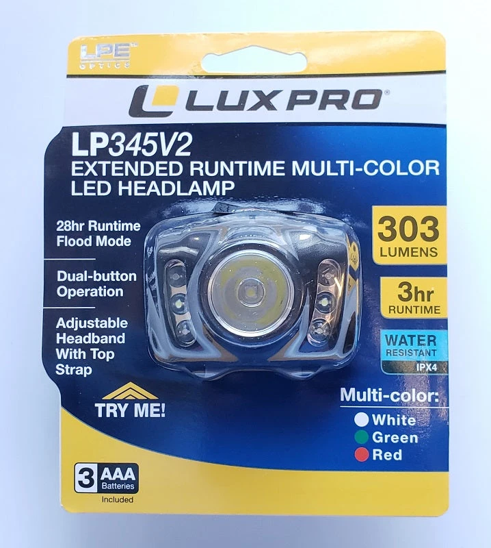The LUXPRO Extended Runtime LED headlamp is a reliable and bright headlamp with over 300 lumens. This headlamp is versatile with 6 modes: SPOT high, low, strobe, and FLOOD white, red, and green. The dual button operation allows you to easily cycle through the 6 modes. This headlamp has a max run time of 28 hours and conveniently operates on 3 AAA batteries which are included. The headband is adjustable, comfortable, and features non-slip stitching for a stable and comfortable fit. There is an over-the-head strap to use with helmets and/or hardhats that is removable if not needed. Designed with a 45-degree pivoting head to shine light exactly where it’s needed. This light has an IPX4 waterproof rating and is backed by a limited warranty against the manufacturer’s defects.