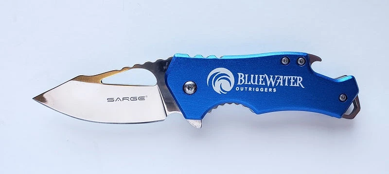 Assisted opening pocket knife and bottle opener. The sleek design Includes a blue anodized aluminum handle with a white Bluewater Outriggers logo and a 2.375-Inch mirror polished blade. Bring this knife everywhere with you as it fits comfortably in your pocket and includes a pocket clip.