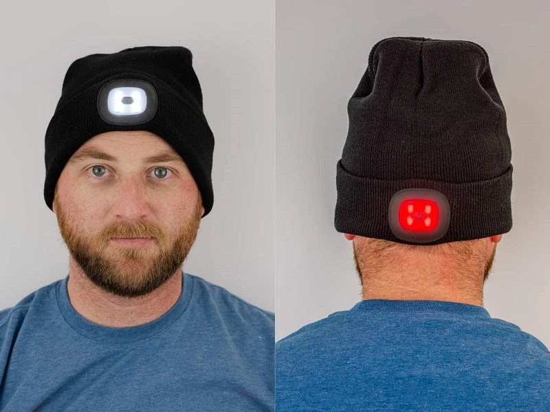 - This beanie has useful buttons with 5 modes: 3-stage white light with 25%, 50%, and 100% power, and 2-stage red light with 100% power and strobe light. The 100% function light is ideal for illuminating a wider area.