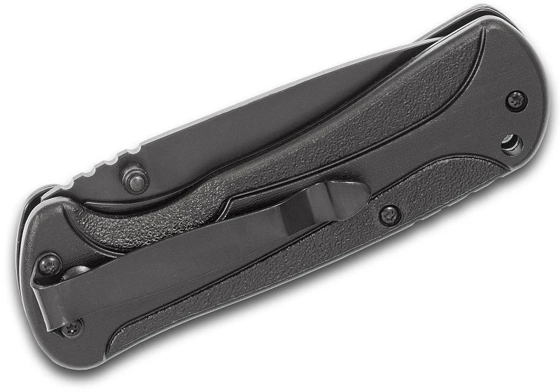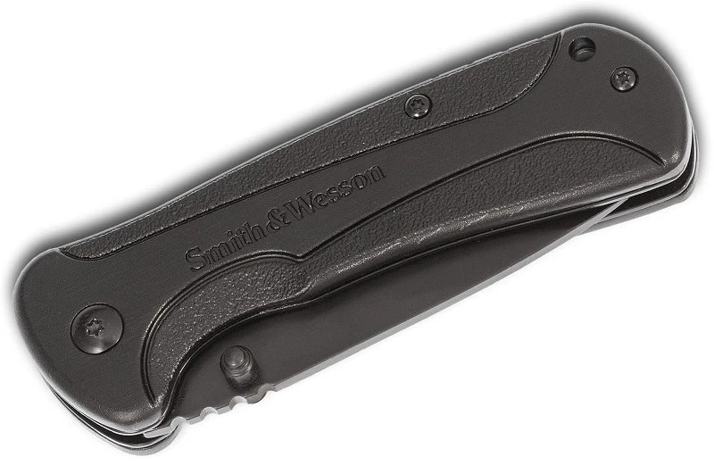 The Smith & Wesson 1084304 features a 3.25″ 8Cr13MoV black drop point blade with a spring assisted mechanism. 8Cr13MoV is a high-quality stainless steel similar in properties to AUS-8. This steel exhibits extreme toughness and excellent edge retaining capabilities. The handles are made from textured aluminum and stainless steel liners. The blade springs open with a slight push of the dual thumb studs. The thumb studs are ambidextrous but there is only one set of holes drilled for the tip-down deep carry pocket clip so it cannot be reversed. The knife is a great value for a fast opening assisted knife from Smith & Wesson.