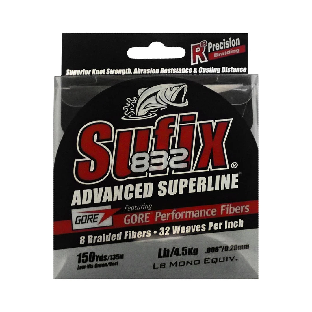 Sufix® 832® Advanced Superline® is the strongest, most durable small diameter braid on the market. R8 Precision Braiding and fiber technology provides superior strength, roundness and line consistency. 832 Advanced Superline has 8 fibers (7 HMPE fibers plus 1 GORE® Performance Fiber) and 32 weaves (pics) per inch. GORE® Performance Fibers improve abrasion resistance, increase casting distance & accuracy and reduce line vibration. HMPE fibers provide high strength & sensitivity, hydrophobic water-repellent protection and small diameter.