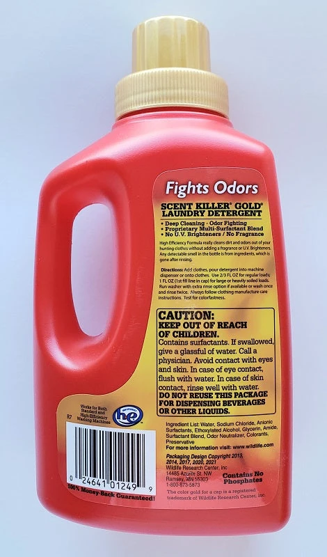 Wildlife Research has set the new standard in clothing wash Scent Killer technology with their Gold Series. The powerful anti-odor formula contains a special H. E. Formula with no UV brighteners. Ultra concentrated odor fighting power and you get twice as many loads to an ounce compared to regular Scent Killer Liquid Clothing Wash.